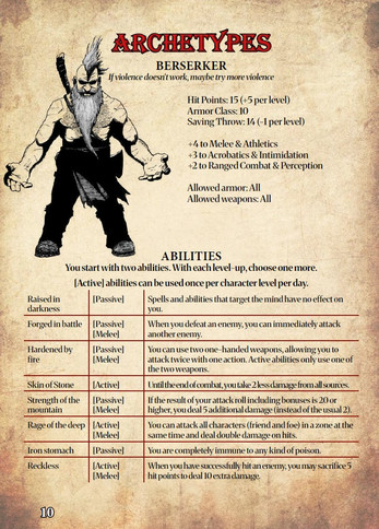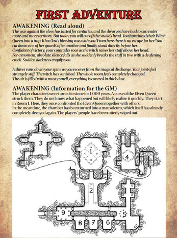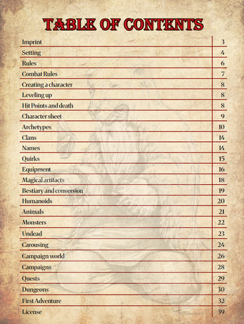 Complete with a starting adventure and everything you need. Four Archetypes of dwarves, carousing, a campaign world and so on.